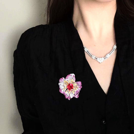 Bague de cocktail fleur rubis et diamants en or blanc 18 carats