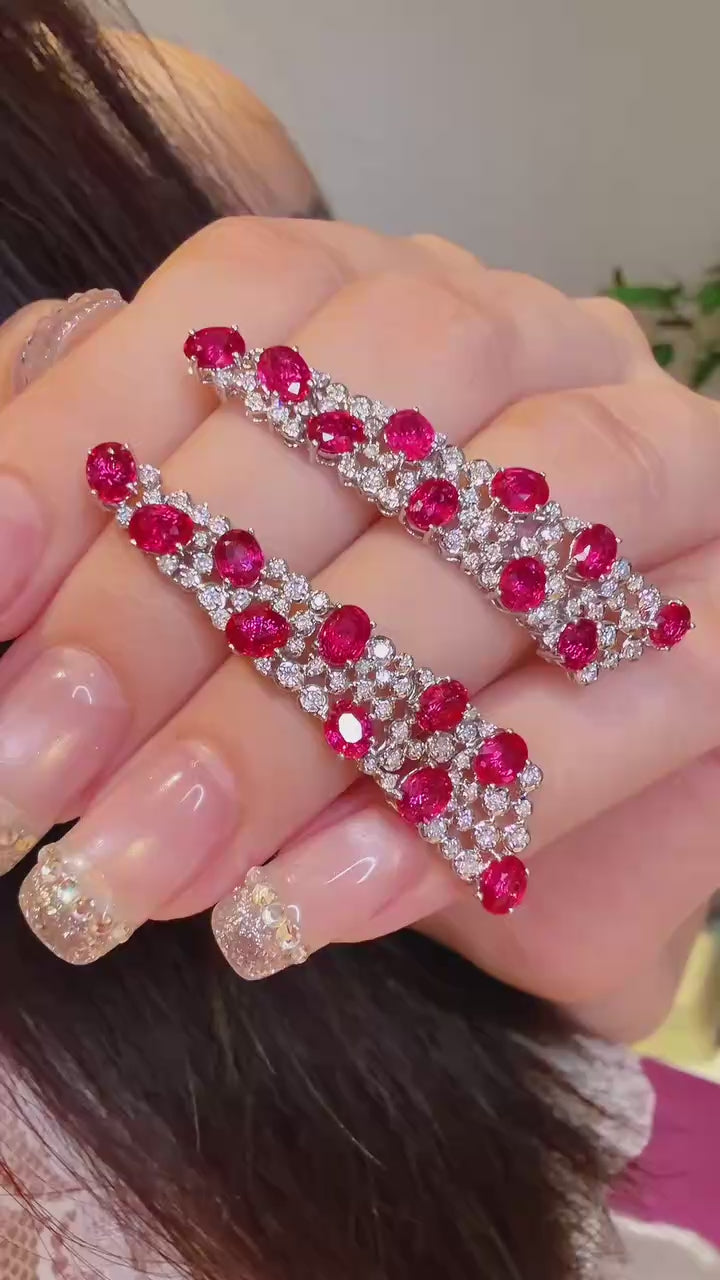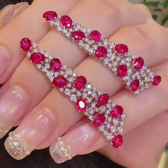 These elegant drop earrings feature 5ct oval cut rubies, the perfect centerpiece for a statement piece of jewelry. Complemented by 1.30ct of brilliant white diamonds, these earrings are set in luxurious 18K white gold, offering a beautiful balance of color and sparkle. The oval cut rubies radiate with vivid, rich red hues, while the diamonds add exceptional brilliance and fire.