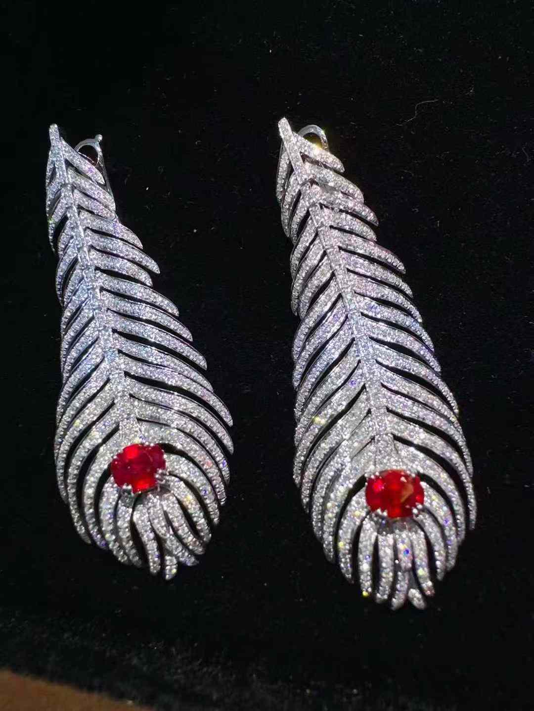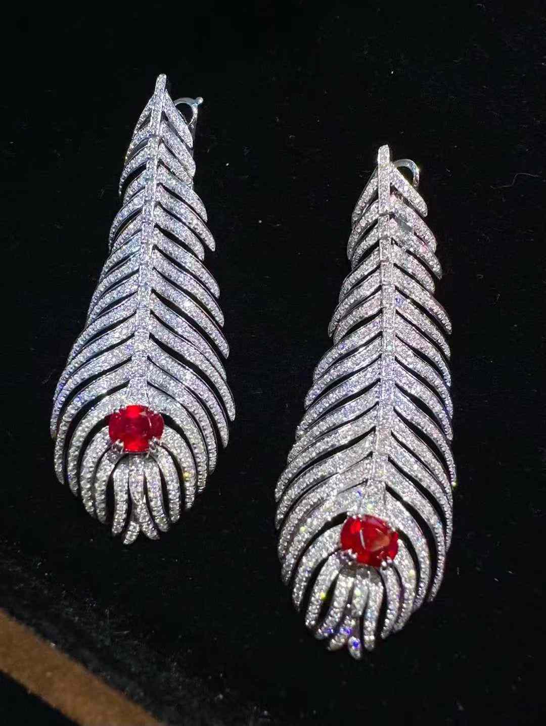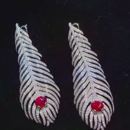 Discover the exquisite beauty of these Mozambique unheated pigeon blood ruby feather drop earrings. Featuring a stunning 2.00-carat main stone in a radiant pigeon blood red hue, these earrings are set in luxurious 18K gold, radiating timeless elegance. Accentuated by 2.60 carats of diamonds, they boast a perfect combination of refined craftsmanship and feminine sophistication.